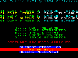 ![]() JSWED2 Jet Set Willy Editor v2 by John Elliot for Windows | ![]() JSWEdit.zip "JSW Editor Mk II" by Softricks | ![]() JSWEDIT3.zip JSW Editor by Mark Jeffries | ![]() SWAN.zip JET SET WILLY EDITOR by Richard Swan | ![]() Jet Set Willy for RISC OS includes a game editor in the program. |